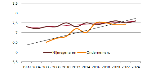 Figuur: Waardering woon- en leefklimaat in Nijmegen, door bewoners en ondernemers. Bronnen: Burgerpeiling en Monitor Vestigingsklimaat, gemeente Nijmegen.