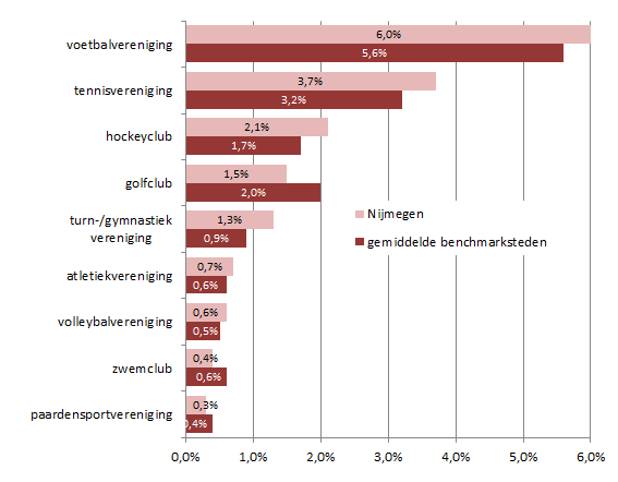 Als we vergelijken met het landelijk beeld zijn de grootste verschillen dat Nijmegen relatief veel leden van hockeyverenigingen en relatief weinig leden van golfclubs, zwemclubs em paardensportverenigingen heeft.